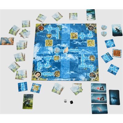 Flow is a cooperative game where players work together to connect four animal spaces to the boat tile in the center of the board by drawing and playing tiles. If the players run out of tiles and the animals haven't been connected to the boat, they all lose. In addition, the game uses a timer, and each time the time runs out, players roll two dice that indicate where the giant wave hits and sweeps away any tiles already placed. Do you have what it takes to save the animals?
