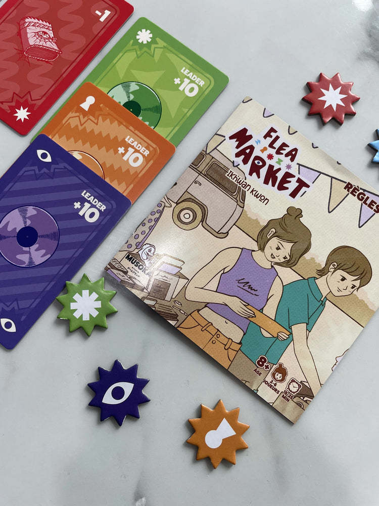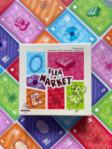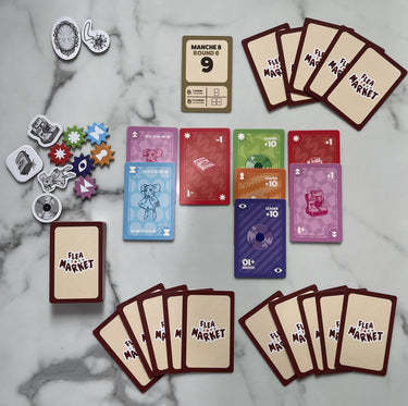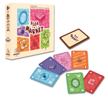 Chaque joueur joue des cartes trouvaille de sa main, accumulant points et surprises. Mais attention : certaines cartes sont maudites et peuvent vous faire perdre gros. Le twist ? Vous passerez une grande partie du temps à ne pas vouloir collectionner, tout en essayant de marquer le plus de points possible. Simple à apprendre, rapide à jouer et plein de rebondissements, Flea Market combine collection, stratégie et humour noir pour des parties interactives et familiales. Chaque décision compte : saurez-vous être malin et résister à la tentation des trésors maudits ?