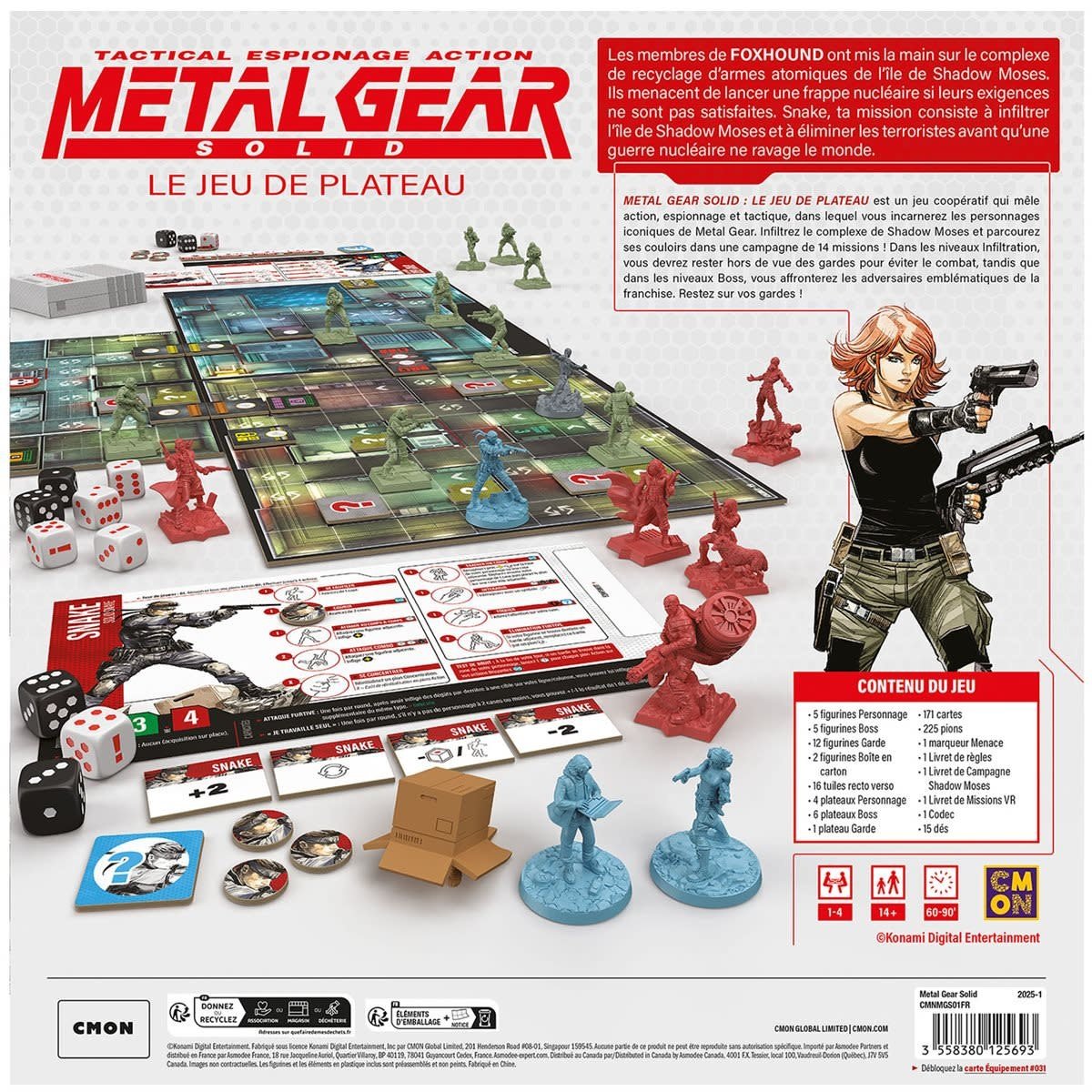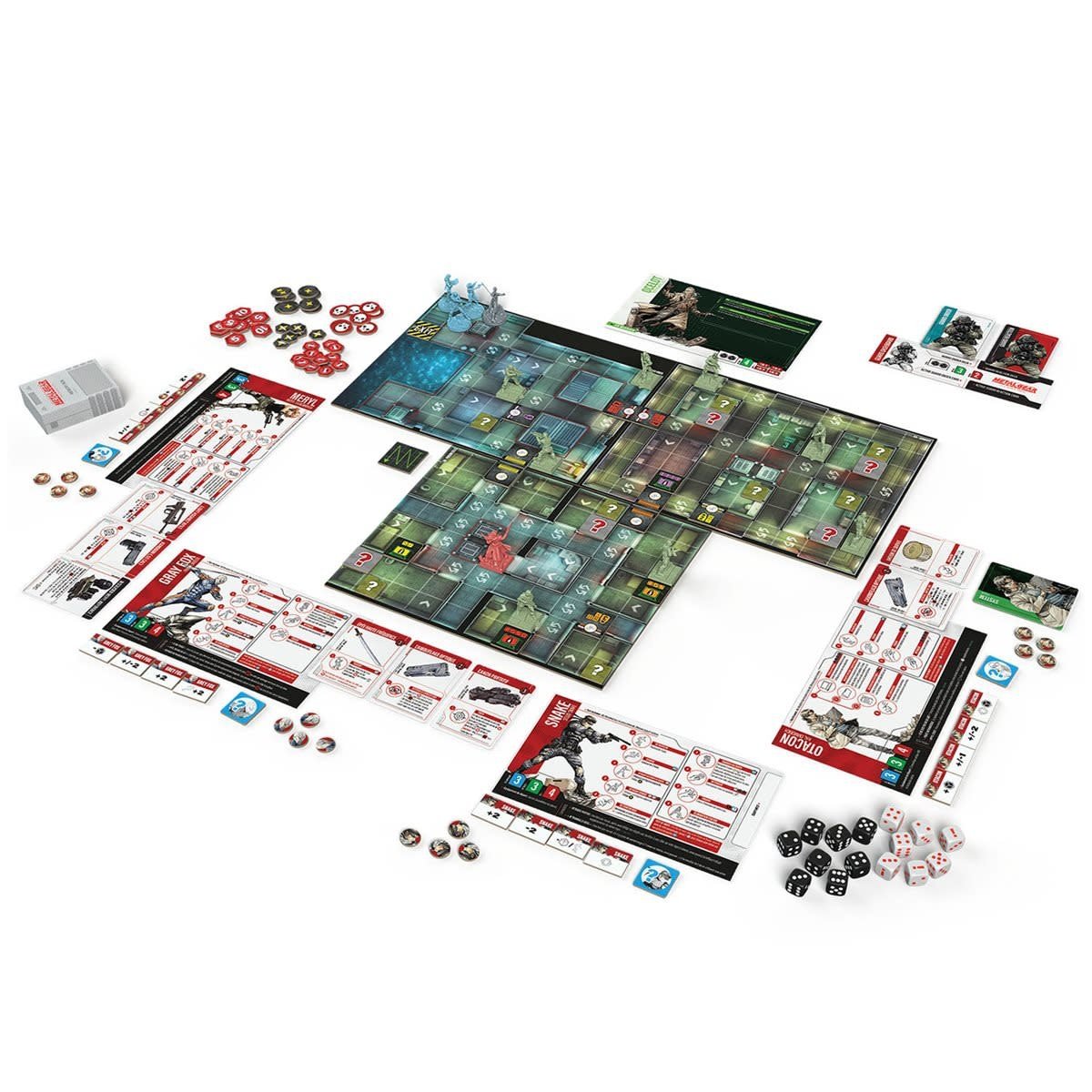 Dans Metal Gear Solid : Le Jeu de Plateau, les joueurs incarnent des personnages emblématiques de la célèbre franchise de jeux vidéo. Solid Snake, Meryl Silverburgh, Gray Fox et Hal « Otacon » Emmerich doivent travailler en équipe pour traverser la campagne de Shadow Moses, gardant leur esprit alerte alors qu’ils progressent furtivement à travers le complexe ennemi.