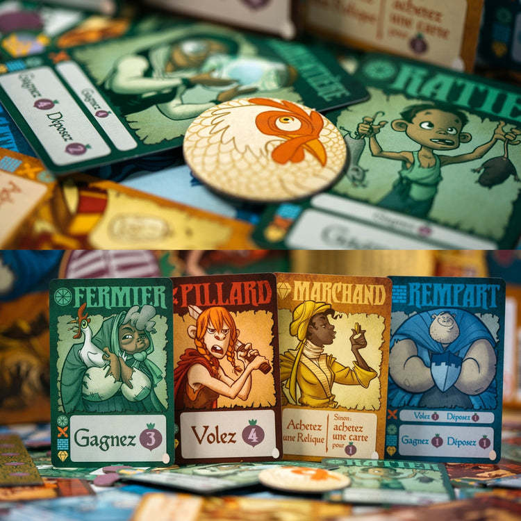 Le Paysan récolte des navets, le Pillard vole le Paysan et le Marchand, le Rempart protège du Pillard et le marchand recrute ou achète des reliques.